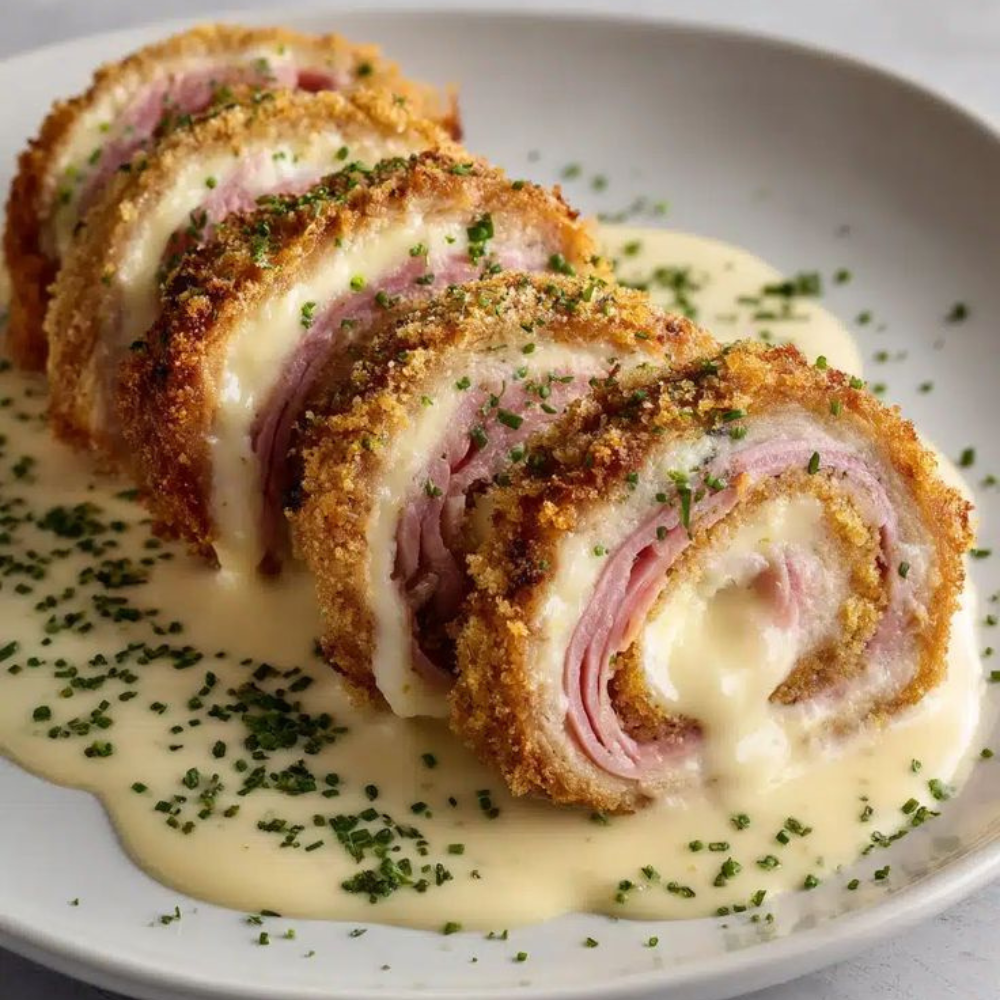 Shallow-fry the chicken Cordon Bleu for 3 - 4 minutes per side, until it reaches an internal temperature of 74°C and is golden brown.
