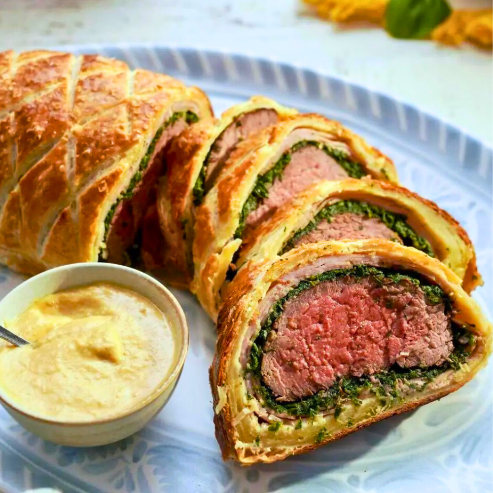 A refined twist on a timeless favourite, our 160g Grass-Fed Beef Wellington showcases a tender slice of turkey ham layered with earthy truffle paste, sautéed spinach, and aromatic onions. Wrapped in golden puff pastry and seasoned with paprika, pepper, and a delicate blend of spices, each bite delivers a luxurious balance of richness and warmth. Ideal for sharing between 1–2 people or serving as a show-stopping centerpiece for any occasion.